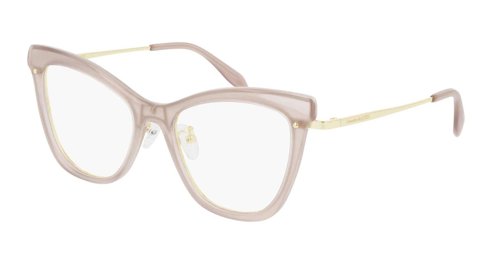 Um formato gatinho extragrande feminino. A frente de acetato é sustentada por uma estrutura de metal esqueletizada visível em transparência. O logotipo Alexander McQUEEN é gravado a laser na leve haste de metal.