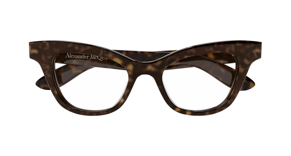 Tomando como inspiração o visual dos anos 50, esta família foi projetada com a alma do rock de McQueen em mente: formatos vintage arrojados combinam com um visual extragrande. Formato gatinho estreito feminino em acetato. O logotipo Alexander McQueen é aplicado a laser nas hastes tom sobre tom com a armação. A paleta monocromática McQueen é parte integrante dos últimos lançamentos da Maison focada em histórias de cores fortes e atraentes. Inclui tons clássicos brilhantes e o vermelho da McQueen.