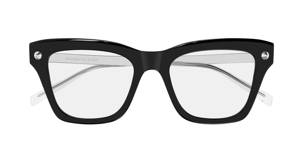 A família charneira de caveira combina o elemento em formato de garfo com a caveira, assinatura icônica da oferta Alexander McQueen, uma proposta sutil, mas identificável. Formato gatinho feminino com hastes de metal e frente de acetato com garfo terminando com uma caveira. O logotipo Alexander McQueen é gravado a laser nas hastes. As hastes em dourado e prateado brilhantes combinam com frentes em tons clássicos ou modernos e lentes degradê.