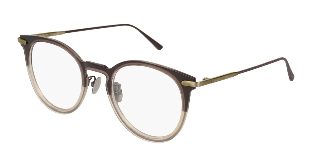 Elegante formato pantos, caracterizado por uma construção extremamente leve e perfis finos. O motivo Intrecciato é finamente gravado em uma lâmina metálica posicionada atrás da frente injetada, revelando-se através das sofisticadas combinações de cores. A construção frontal sofisticada evidencia o alto nível de expertise envolvido na criação dessas armações. O logotipo BOTTEGA VENETA é elegantemente gravado a laser nas hastes. O padrão Intrecciato, esmaltado em tom sobre tom com os matizes da frente, expressa a meticulosa atenção aos detalhes. Modelo com ajuste inteligente para o mercado asiático (Smart Asian Fitting).