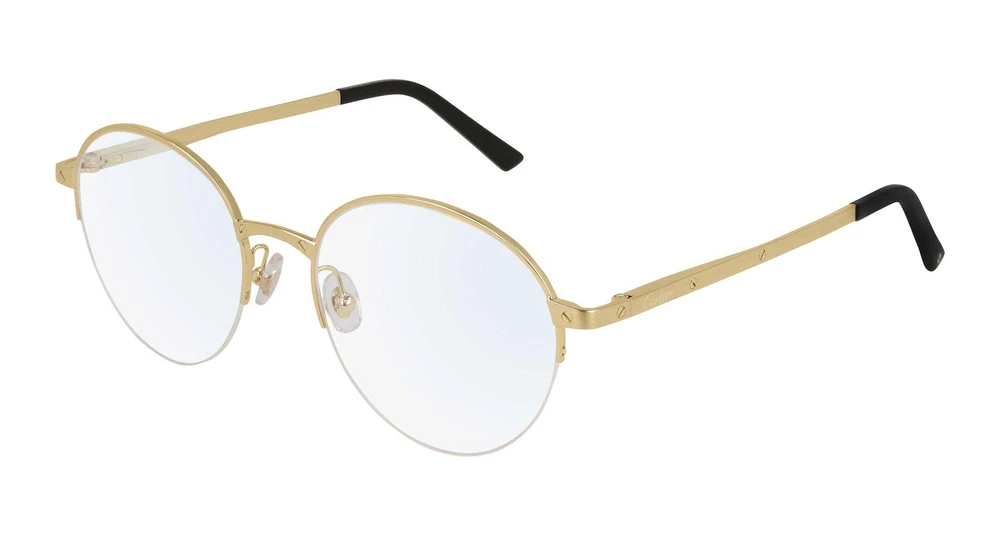 Formato redondo moderno, semiarro, totalmente em metal. Detalhes com os parafusos Santos, símbolo icônico da coleção Santos de Cartier. Armação com acabamento precioso escovado (em ouro ou platina), em contraste com parafusos de acabamento liso (também em ouro ou platina). Hastes equipadas com dobradiças flexíveis e ponteiras que proporcionam melhor ajuste da armação e maior conforto. Logotipo Cartier gravado nas hastes e assinatura Double C Décor nas plaquetas nasais.