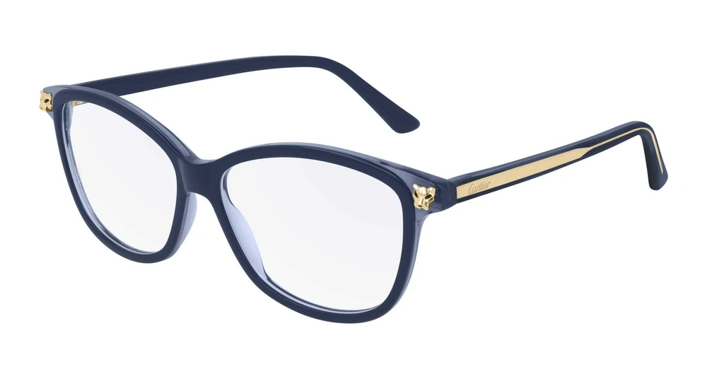 Formato cat-eye suave, com a emblemática Panthère de Cartier, oferecendo um design elegante e sofisticado com um toque moderno. Esculturas tridimensionais da cabeça da pantera em metal, com acabamento joalheiro: laca preta nos olhos e no focinho, remetendo ao ônix. Frente em acetato bicolor, com combinações de cores tom sobre tom, e núcleo metálico visível nas hastes de acetato. Logotipo Cartier gravado nas hastes.