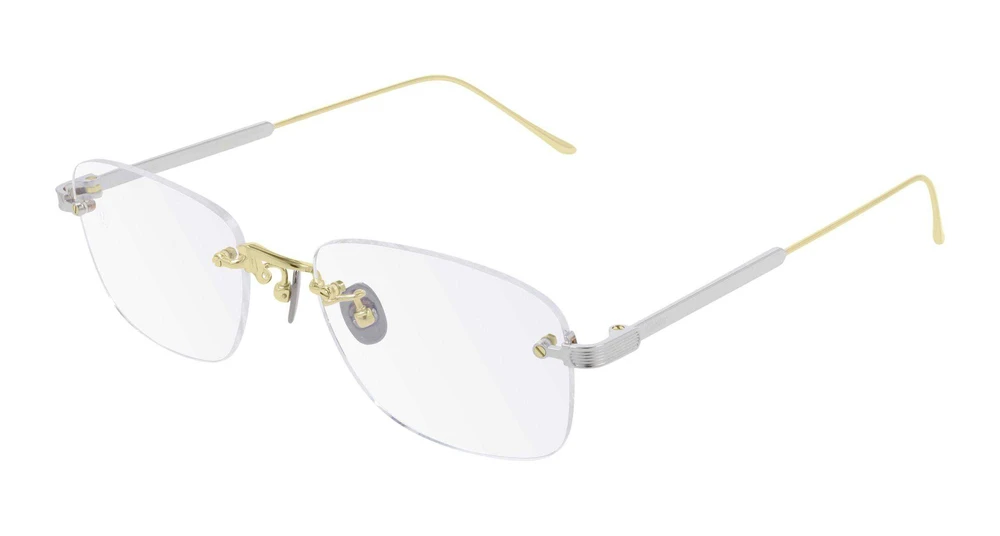 Formato retangular leve e confortável, sem aro, em titânio. C de Cartier como elemento estético e funcional na decoração da ponte, para uma reinterpretação moderna do monograma Cartier. Tratamento bi-galvânico nas hastes, com acabamento precioso em ouro e platina. Logotipo Cartier gravado nas hastes e assinatura Double C Décor nas plaquetas nasais.