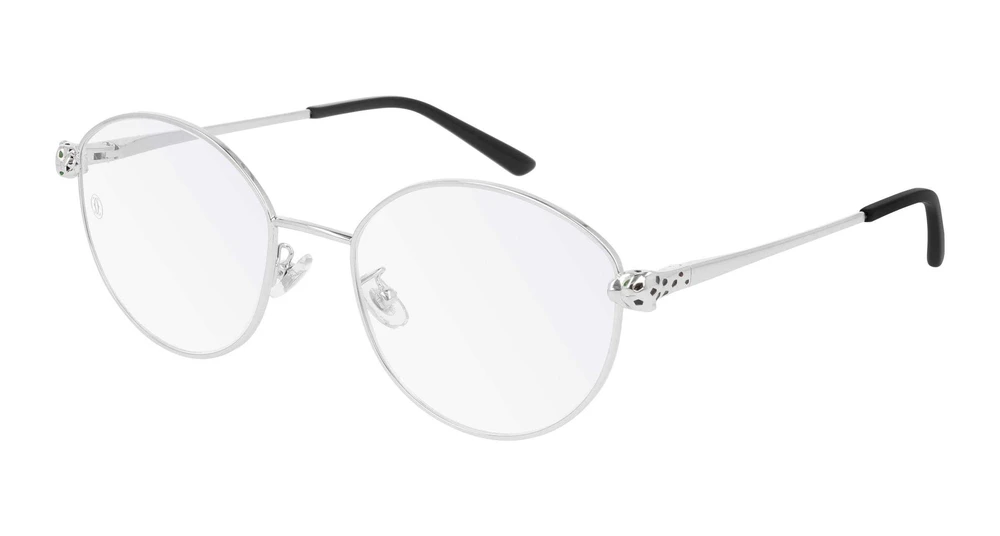 Formato arredondado e suave com aro completo, apresentando a emblemática Panthère de Cartier para um design audacioso e glamouroso. Cabeça e corpo da pantera em metal esculpido tridimensionalmente, delicadamente envernizados como elemento decorativo e estrutural nas dobradiças. Detalhes em laca: preto para o nariz e manchas para lembrar ônix, e verde para os olhos para remeter ao esmeralda. Logo Cartier gravado nas hastes de metal com ponteiras em acetato e acabamento precioso em ouro.