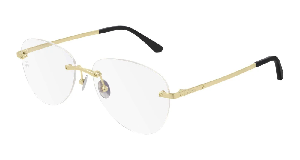 Formato piloto sem aro para uma estética elegante e masculina. Estrutura leve em titânio, enriquecida com o icônico motivo dos parafusos Santos nas hastes, que remete ao audacioso design Santos de Cartier. Ponteiras em acetato que replicam o recorte da caixa do relógio Santos, também adornadas com o icônico parafuso. Logotipo Cartier gravado nas hastes de titânio com ponteiras em acetato, acabamento precioso em ouro e platina.