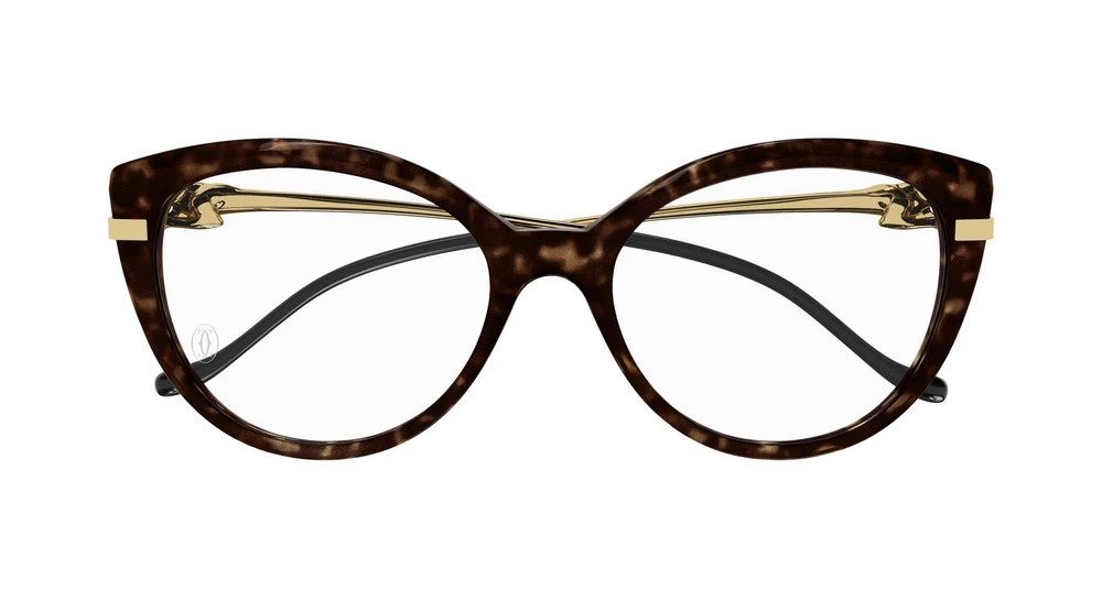 Formato feminino em estilo cat-eye com frente totalmente em acetato. Hastes metálicas adornadas com a nova escultura dinâmica da cabeça e corpo da Panthère. Ponteiras das hastes confortáveis, que remetem ao movimento da cauda da Panthère. Acabamento precioso em ouro.