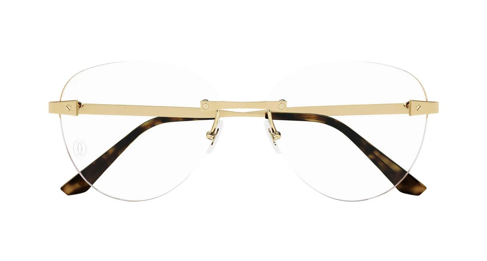 Formato borboleta sem aro (rimless). Haste metálica sofisticada, enriquecida pelos icônicos parafusos Santos. Design leve que garante conforto e facilidade de uso. Acabamento precioso em ouro.