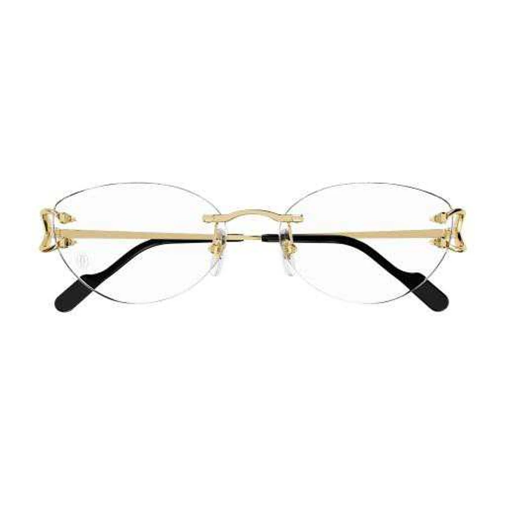 Óculos de grau com construção sem aro realçada pela icônica decoração C de Cartier sendo um elemento funcional e estético da charneira em metal. Novo formato gatinho feminino para garantir um visual sofisticado e moderno. Ponteiras de acetato com etiqueta com logotipo Cartier para garantir conforto. Precioso acabamento em ouro e platina.