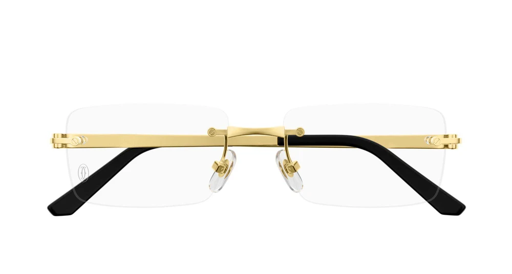 Nova variação do estilo clássico Santos com frente em titânio e hastes em beta-titânio para garantir ultra leveza, flexibilidade e conforto. Formato retangular fácil de usar, em construção sem aro, combinado com as hastes clássicas Santos adornadas pelos icônicos parafusos. Acabamentos preciosos em ouro, platina, PVD preto ou rutenio escuro. Logotipo Cartier gravado a laser na haste, ponteiras em acetato decoradas com o motivo dos parafusos Santos e assinatura Double C Décor nas plaquetas nasais.