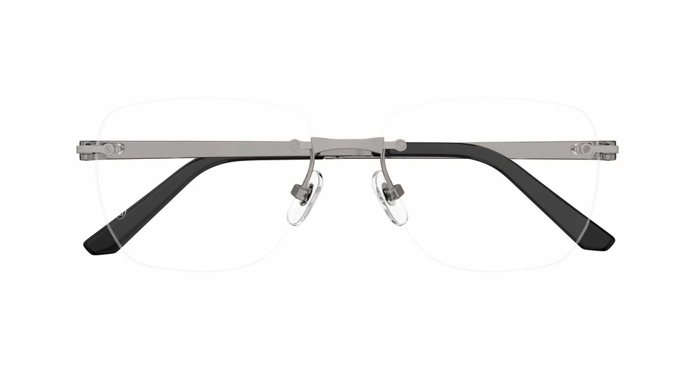 Nova versão do estilo clássico Santos, com frente em titânio e hastes em beta-titânio para garantir ultraleveza, flexibilidade e conforto. Formato retangular em construção sem aro, combinado com as hastes clássicas Santos, adornadas pelos icônicos parafusos. Acabamentos preciosos em ouro, platina, PVD preto ou rutênio escuro. Logotipo Cartier gravado a laser na haste, ponteiras em acetato decoradas com o motivo dos parafusos Santos e assinatura Double C Décor nas plaquetas nasais.
