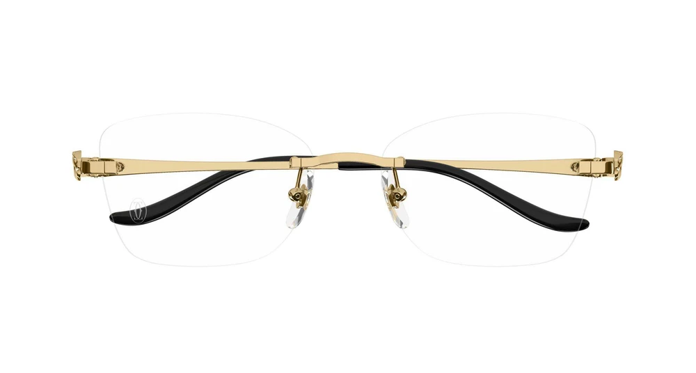 Panthère bidimensional reformulada, totalmente em metal, com o corpo da Panthère que percorre toda a haste. Formato feminino e versátil soft cat eye, em construção sem aro. Dobradiça adornada pela icônica silhueta da Panthère, desenhada em cada detalhe. Acabamento precioso em ouro ou platina, ponteiras em acetato que lembram a cauda da Panthère para garantir conforto, e assinatura Double C Décor nas plaquetas nasais.