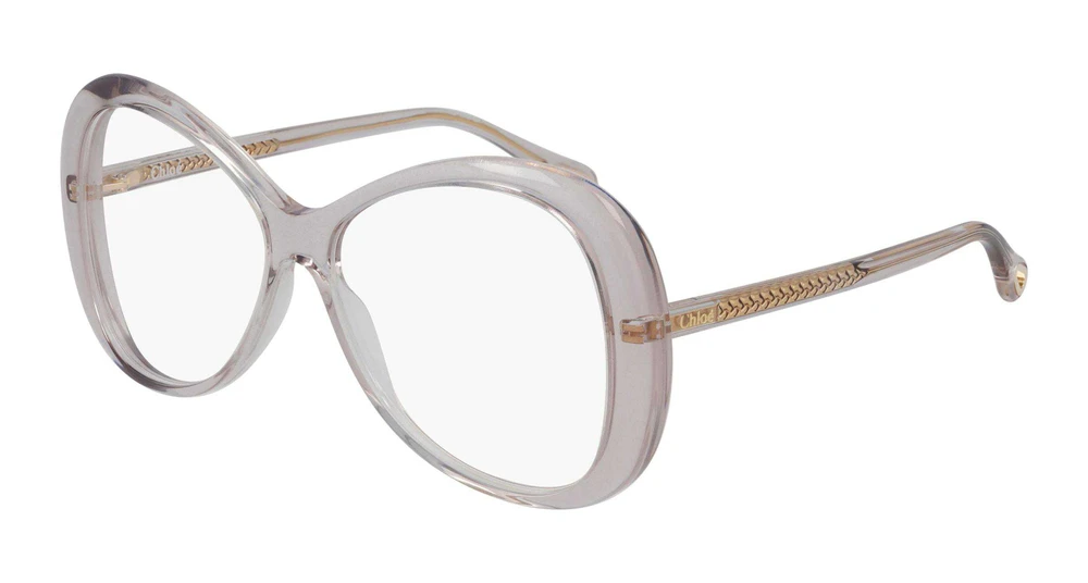 Formato borboleta com a marca registrada da Chloé em material bio acetato. Hastes com núcleo metálico trançado icônico, dedicado, e logo em hot stamping na haste esquerda. Corte em formato de gota, assinatura icônica, que serve de detalhe estético e funcional para a fixação das joias da Chloé nas pontas das hastes, enriquecido com o logo gravado.