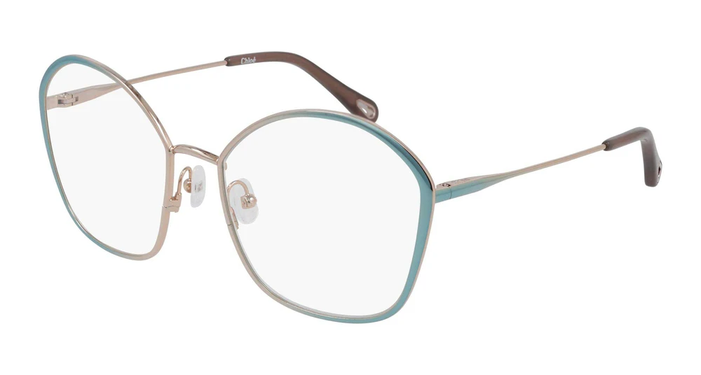 Forma geométrica moderna com inspiração em arco-íris galvânico e dobradiças flexíveis. Hastes de metal com logo laser discreto e profundo no topo da haste esquerda. Pontas das hastes em acetato com o icônico recorte em forma de gota, que serve como detalhe estético e funcional para prender as joias da Chloé, enriquecidas com logo gravado. Logo Chloé também presente nas plaquetas do nariz.