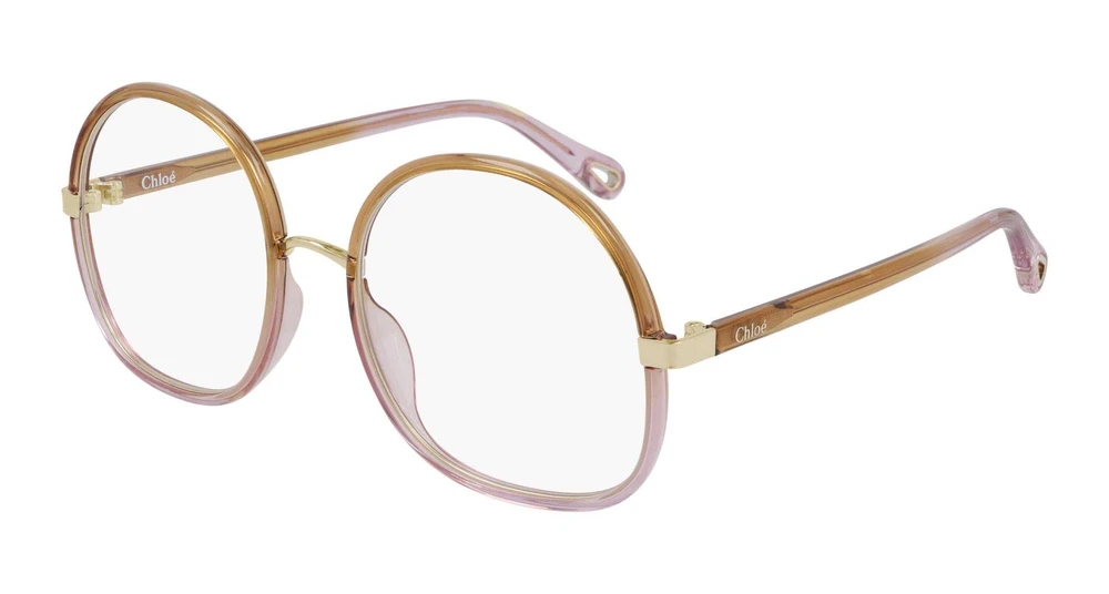 Armação redonda de metal inspirada nos anos 70, com aros injetados em cores de arco-íris e hastes em degradê. Ponte nasal metálica e detalhe metálico dourado ("griffe") que conecta a frente à haste, que possui logotipo em hot stamping na haste esquerda. Recorte icônico em forma de gota na ponta das hastes, que serve como elemento estético e funcional para acoplar as joias de óculos Chloé, enriquecido com o logotipo gravado.