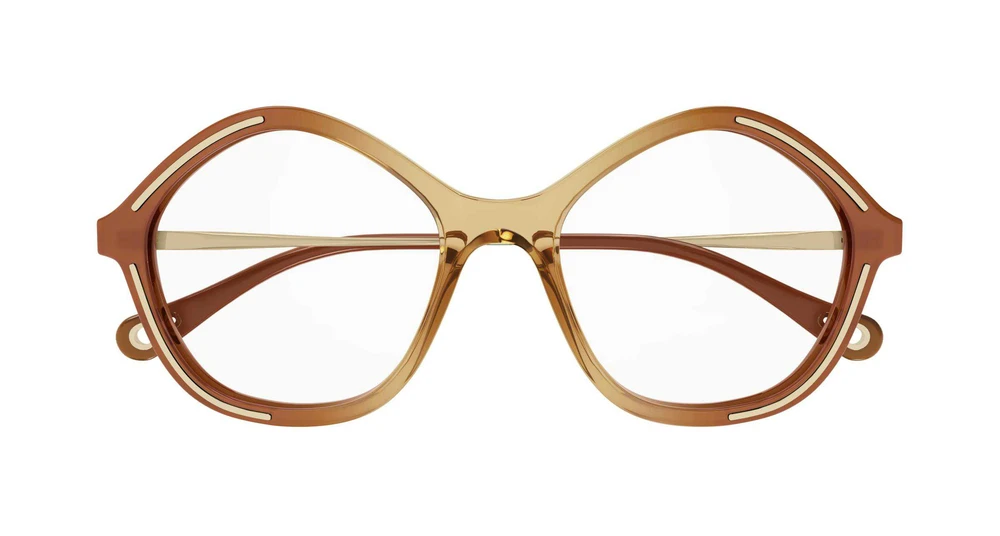 Novo estilo óptico icônico em formato pentágono, com armação em acetato e detalhe metálico envolvendo a parte frontal. Paleta de cores única que lembra tons do arco-íris. Hastes metálicas douradas com dobradiças flexíveis. O recorte icônico em forma de gota nas pontas das hastes serve como elemento estético e funcional para prender as joias dos óculos Chloé, enriquecido com o logo gravado.