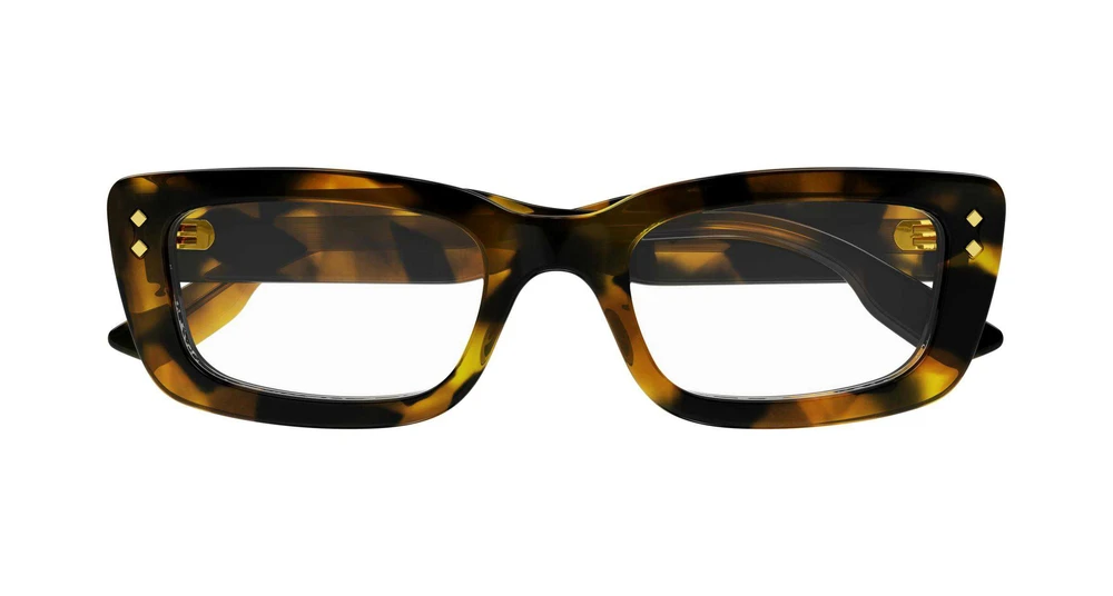 Este modelo retangular estreito é caracterizado por um volume e textura robustos, enriquecidos por icônicos rebites de metal que brilham na frente e nas hastes. O modelo é realçado pelas exclusivas havanas e por um característico fio central de metal e o logotipo Gucci escrito nas hastes.