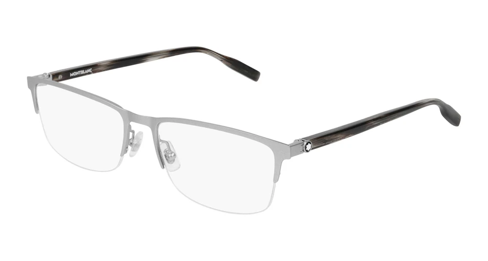 Formato retangular half-rim refinado, em estilo totalmente metálico. Emblema “snow cap” com perfil metálico montado sobre a dobradiça integrada. Motivo “snow cap” ampliado com função antiderrapante, gravado a laser no lado interno das ponteiras. Logotipo Montblanc gravado a laser na haste direita.