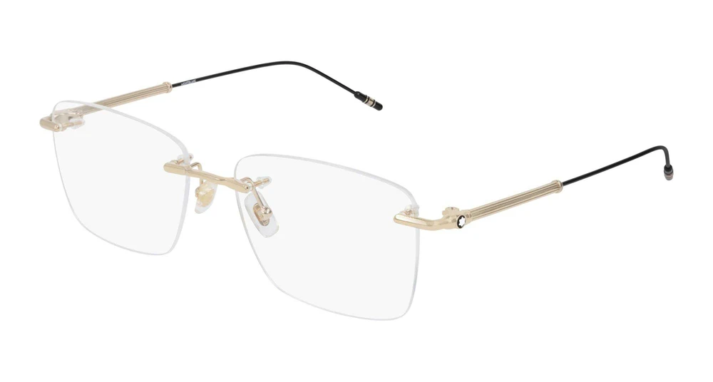 Hastes finas com seção tubular, decoradas com o clássico motivo godron. Emblema autêntico “snow cap” aplicado nas dobradiças. Detalhe dos 3 anéis presente nas ponteiras, remetendo à icônica caneta Meisterstück da Montblanc.