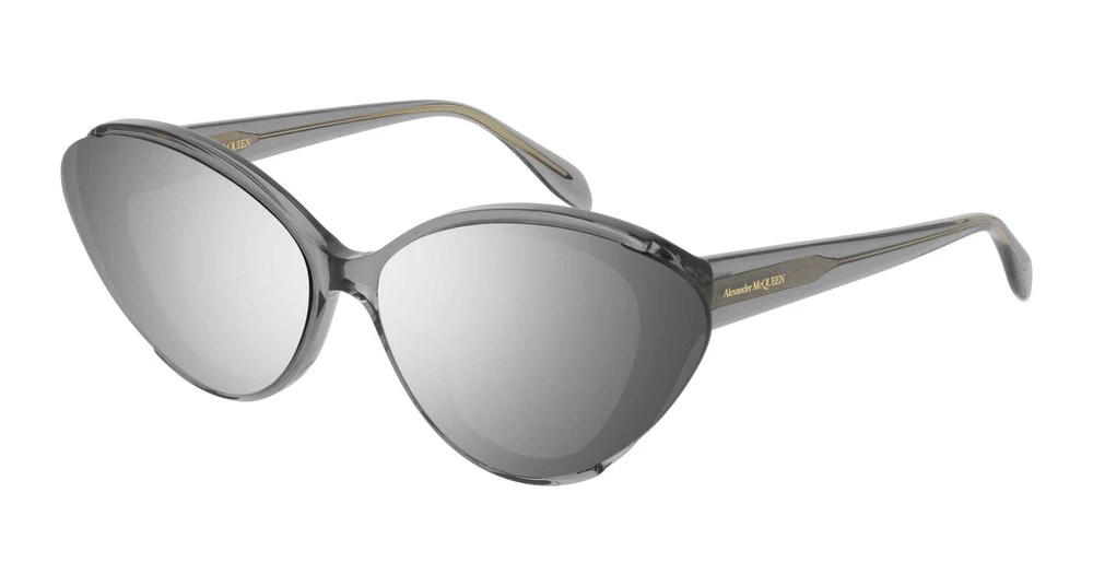 Um formato gatinho feminino inteiramente em acetato. As lentes excedem a visível estrutura de acetato na qual estão fixadas. As hastes de acetato são adornadas com o logotipo Alexander McQUEEN.