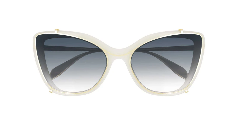 Um formato gatinho combi feminino. O modelo é caracterizado por um leve clip-on em folha de metal, com uma ponte elevada, que tornam esta armação um modelo tanto de óculos de sol quanto óculos de grau. Uma estrutura de encaixe reverso do clip-on torna-o ainda mais leve. O logotipo Alexander McQUEEN é gravado a laser nas hastes de metal caracterizadas pelas ponteiras pontiagudas.