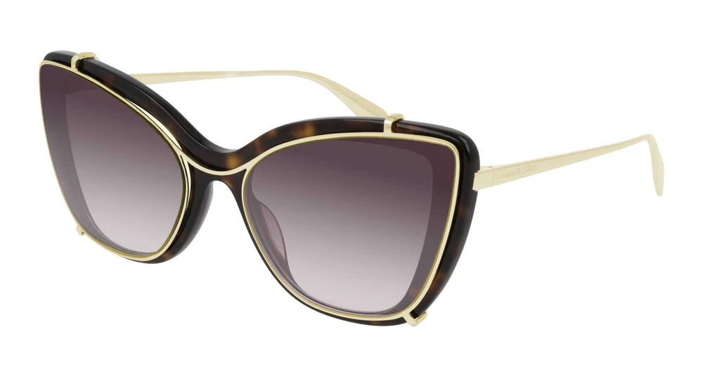 Um formato gatinho combi feminino. O modelo é caracterizado por um leve clip-on em folha de metal, com uma ponte elevada, que tornam esta armação um modelo tanto de óculos de sol quanto óculos de grau. Uma estrutura de encaixe reverso do clip-on torna-o ainda mais leve. O logotipo Alexander McQUEEN é gravado a laser nas hastes de metal caracterizadas pelas ponteiras pontiagudas.