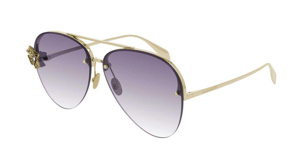 O segmento de joias se destaca por seus modelos de alta qualidade, caracterizados por elementos da flora da AMQ enriquecidos com cristais preciosos. Formato piloto feminino sem aro com lentes aplicadas sobre uma estrutura metálica ornamentada com uma joia de borboleta na lateral da lente direita. A ponte dupla de metal confere refinamento ao modelo. O logotipo Alexander McQUEEN é gravado a laser nas hastes de metal. A paleta de cores é caracterizada pelo ouro brilhante para a armação e lentes degradê coloridas.