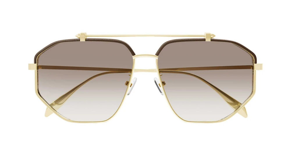 Top Piercing Leather renova o detalhe de piercing, um ícone da marca Alexander McQueen, com uma atitude rebelde, mas sofisticada. Formato navegador geométrico unissex em metal, decorado com a icônica barra superior de piercing na frente e sobrancelhas revestidas de couro. O logotipo Alexander McQueen é gravado a laser na lateral do aro de metal. A paleta de cores inclui metais clássicos brilhantes para a armação e hastes combinadas com lentes clássicas masculinas/unissex, lisas ou degradê. O couro nas sobrancelhas é essencialmente no mesmo tom das lentes para criar combinações mais comerciais e fáceis de usar.