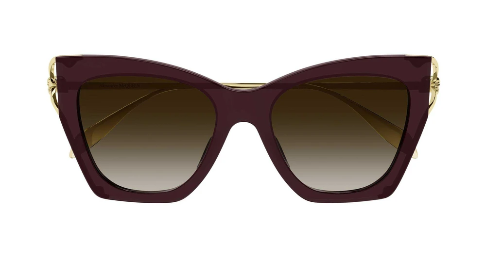 A família charneira de caveira combina o elemento em formato de garfo com a caveira, assinatura icônica da oferta Alexander McQueen, uma proposta sutil, mas identificável. Formato gatinho feminino com hastes de metal e frente de acetato com garfo terminando com uma caveira. O logotipo Alexander McQueen é gravado a laser nas hastes. As hastes em dourado e prateado brilhantes combinam com frentes em tons clássicos ou modernos e lentes degradê.