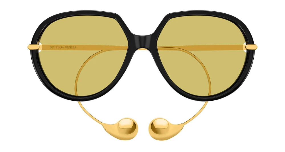 Formato redondo de inspiração vintage oversize. Icônica lágrima na ponteira. Ponteira metálica que envolve o frontal através de um orifício na lente e um ligeiro detalhe na lateral.