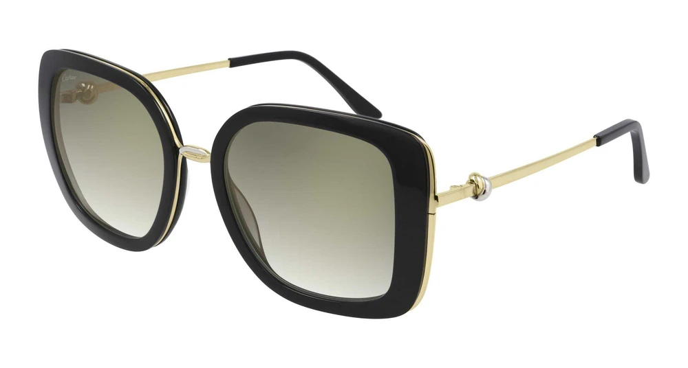 Formato quadrado oversized feminino, enriquecido por aros em acetato que envolvem a estrutura metálica com tratamento bi-galvânico. A ponte é marcada por um nó inspirado no anel Trinity e suas três bandas entrelaçadas. As hastes são adornadas com o anel Trinity e com o logotipo Cartier gravado. Ponteiras em acetato e assinatura Double C Décor nas plaquetas nasais.