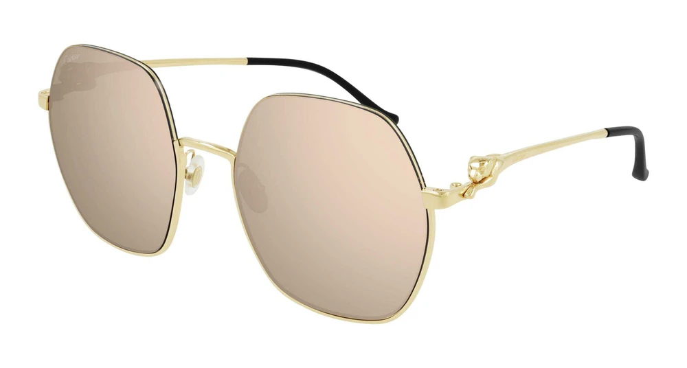 Formato geométrico oversized com construção meia-aro invertida para um visual elegante e feminino. Nova cabeça e corpo esculpidos da Panthère em movimento dinâmico nas hastes de metal. Ponteiras confortáveis que remetem ao movimento da cauda da Panthère. Acabamento precioso em ouro.