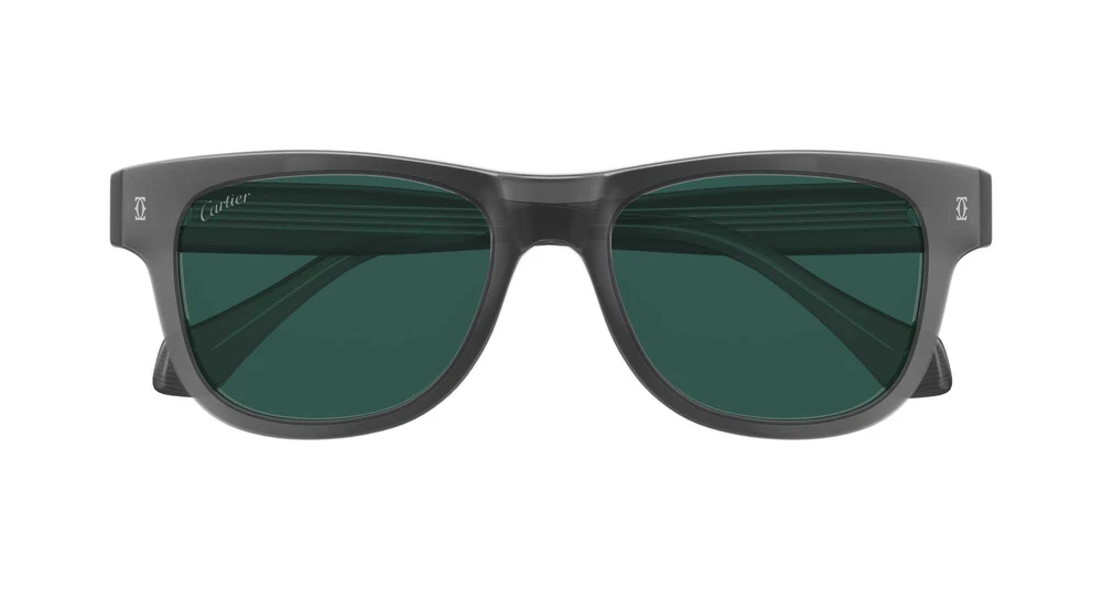 Núcleo metálico com o detalhe Godron visível na parte interna das hastes, através de um acetato bicamada com efeito cristal. Formato retangular clássico em uma armação robusta de acetato. Logotipo Double C foto gravado na junção frontal e placa com o logotipo Cartier nas hastes. Ponteiras com aderência aprimorada para garantir máximo conforto.