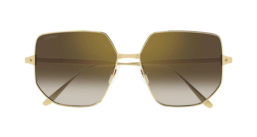 Formato hexagonal oversize, elegante e feminino. Hastes metálicas sofisticadas, enriquecidas pelos icônicos parafusos Santos. Design leve para garantir conforto e usabilidade. Acabamento precioso em ouro.