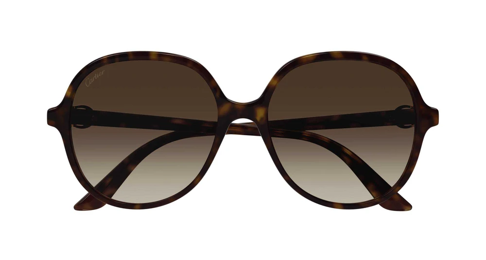 Formato redondo oversize feminino, enriquecido pelo icônico C Décor como elemento estético e funcional da dobradiça. Introdução do Bio-Acetato. Acabamentos preciosos nos detalhes metálicos em ouro e logo Cartier gravado nas hastes.