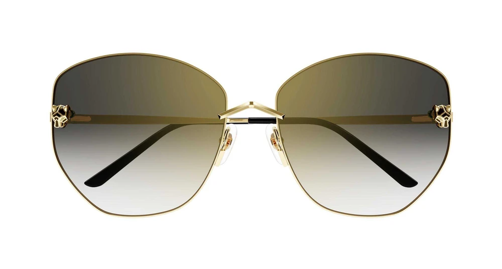 Nova estética da Panthère, caracterizada por uma inovadora cabeça tridimensional com facetas geométricas, enriquecida por detalhes em esmalte. Formato cat-eye suave e ousado, que remete às linhas geométricas da cabeça da pantera. Acabamento precioso em ouro, com ponteiras em acetato para garantir conforto. Detalhe em esmalte em tom sobre tom com a cor das lentes.