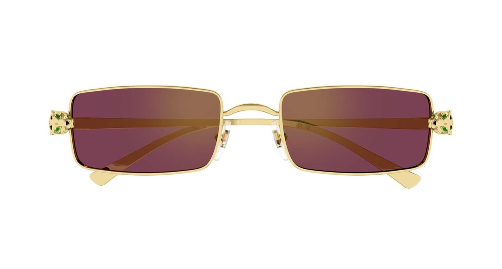 Nova reinterpretação contemporânea e estilosa da estética Panthère Massai, inspirada nas joias Cartier. Construção retangular estreita com aro completo, com a cabeça tridimensional da Panthère na frente, garantindo um visual forte e unissex. As hastes metálicas remetem à cabeça e à cauda da Panthère, decoradas com pontos preciosos de esmalte feitos à mão. Acabamento precioso em ouro ou platina e lentes com cores vibrantes que chamam a atenção.