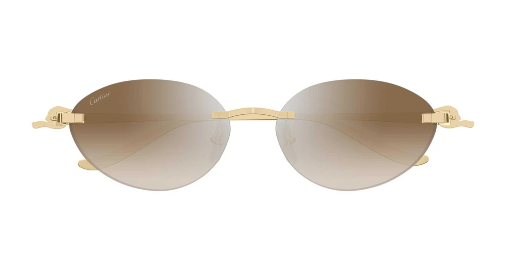 Panthère bi-dimensional reformulada, totalmente em metal, com o corpo da pantera correndo por toda a haste. Formato soft cat-eye feminino e contemporâneo, em construção sem aro, para um visual sofisticado e icônico. Dobradiça adornada pela icônica silhueta da Panthère, detalhadamente trabalhada. Acabamento precioso em ouro, combinado com lentes coloridas e assinatura Double C Décor nas plaquetas nasais.