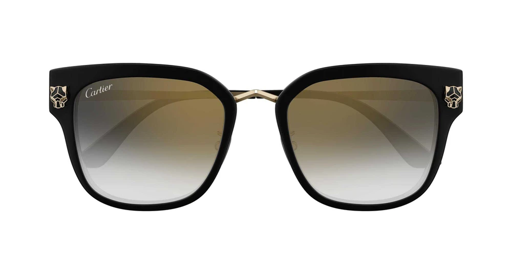 Formato oversized quadrado suave com frente em acetato e hastes metálicas clássicas Panthère para um visual elegante. A frente em acetato é adornada pela cabeça de Panthère tridimensional e facetada, com detalhes em esmalte feitos à mão, inspirados na coleção de artigos de couro. Acabamento precioso em ouro. Ponteiras em acetato com logotipo Cartier para garantir conforto e assinatura Double C Décor nas plaquetas nasais.