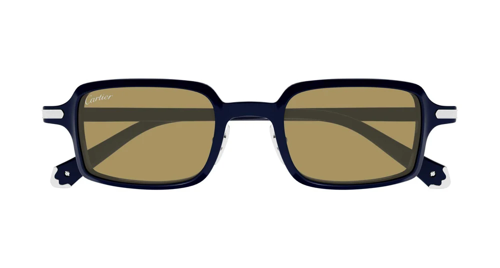Nova estética leve em acetato, enriquecida por sutis elementos metálicos: o ícone Godron na dobradiça e peças sofisticadas nas pontas das hastes, inspiradas na coleção de artigos de couro. Formato moderno e unissex, retangular estreito, ideal para um visual elegante e icônico. Acabamentos preciosos em ouro ou platina, combinados com lentes coloridas em tom pastel e logo Cartier nas hastes.