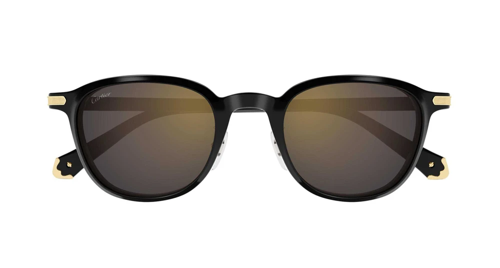 Nova estética em acetato leve, enriquecida por sutis elementos metálicos: o ícone Godron na dobradiça e detalhes sofisticados inspirados na coleção de artigos em couro da Maison nas ponteiras. Forma arredondada de fácil uso, oferecendo um visual moderno e ao mesmo tempo icônico. Acabamentos preciosos em ouro ou platina e logotipo Cartier nas hastes.