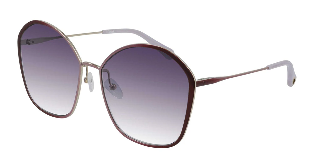 Formato geométrico oversized e fashion, com lentes em degradê inspiradas no efeito arco-íris galvanizado. Hastes metálicas com logotipo discreto gravado a laser no topo da haste esquerda. Pontas das hastes em acetato com o icônico recorte em forma de gota, que funciona como um elemento estético e funcional para prender as joias de óculos Chloé, enriquecido com o logotipo gravado. Plaquetas nasais com logotipo Chloé.