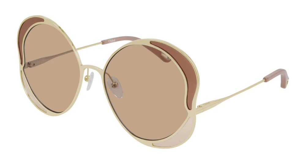 Formato geométrico marcante e sofisticado, com inserções plásticas coloridas que criam um efeito visual integrado às lentes. Hastes em metal com logo discreto gravado a laser na parte superior da haste esquerda. Pontas das hastes em acetato com o icônico recorte em forma de gota, servindo como elemento estético e funcional para prender as joias de óculos da Chloé, enriquecidas com o logotipo gravado. Logotipo Chloé nas plaquetas nasais.