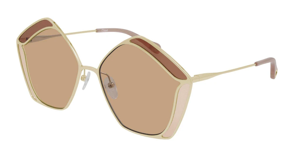 Formato geométrico marcante e sofisticado, com inserções de plástico colorido que criam um efeito visual único nas lentes. Hastes metálicas com logo a laser discreto na parte superior da haste esquerda. Ponteiras em acetato com o icônico recorte em forma de gota — assinatura da Chloé — que serve como elemento estético e funcional para fixar as joias da marca, enriquecidas com o logo gravado. Logo Chloé também presente nas plaquetas nasais.