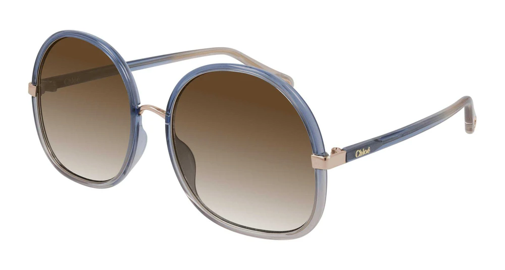 Armação oversize redonda inspirada nos anos 70, em metal com bordas injetadas em cores do arco-íris e lentes degradê, acompanhada por hastes também coloridas. Ponte metálica no nariz e griffe dourado que conecta a borda frontal à haste, com logo em hot stamping na haste esquerda. O icônico recorte em forma de gota nas pontas das hastes serve como detalhe estético e funcional para prender as joias da Chloé, enriquecido com o logo gravado.