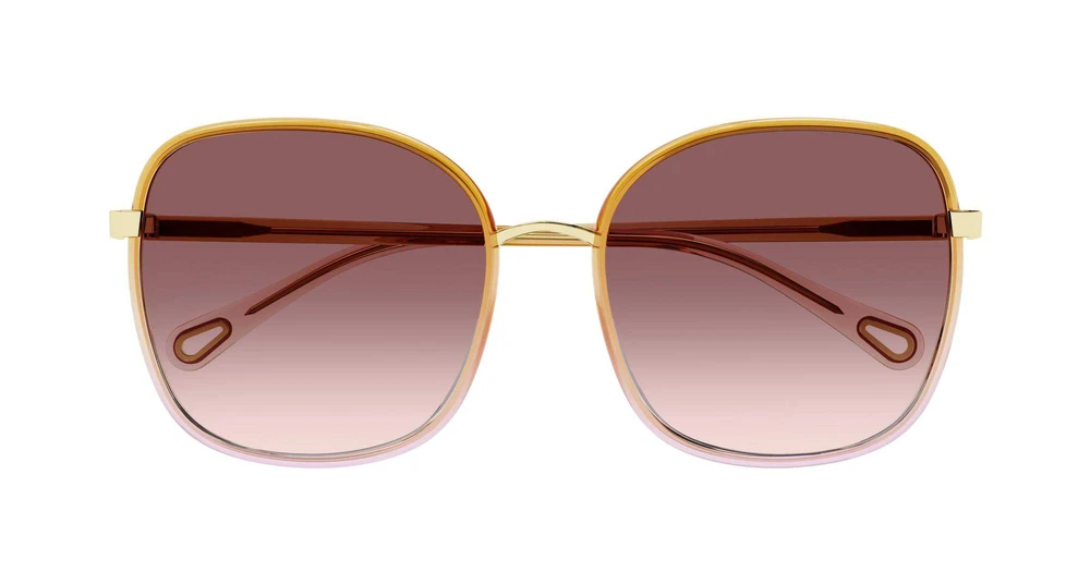 Armação combinada em formato quadrado com aros plásticos coloridos em degradê, lentes em degradê e hastes em acetato. Ponte nasal metálica e detalhe metálico dourado (griffe) que conecta a parte frontal da armação às hastes, com logotipo em hot stamping na haste esquerda. O icônico recorte em forma de gota na ponta das hastes funciona como um elemento estético e funcional para prender as joias de óculos Chloé, enriquecido com o logotipo gravado.