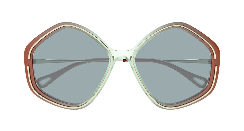 Novo estilo com formato icônico pentagonal em uma armação de acetato, com aplicação metálica contornando a parte frontal. Paleta de cores exclusiva que remete aos tons do arco-íris. O icônico recorte em forma de gota na ponta das hastes funciona como um detalhe estético e funcional para prender as joias dos óculos Chloé, enriquecido com o logotipo gravado.