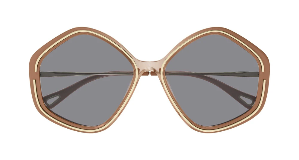 Novo modelo com formato pentagonal icônico, em armação de acetato com aplicação metálica envolvendo a parte frontal. Paleta de cores única que remete aos tons do arco-íris. Possui o icônico recorte em forma de gota na ponta das hastes, servindo como detalhe estético e funcional para prender as joias da linha de óculos Chloé, enriquecido com o logotipo gravado.