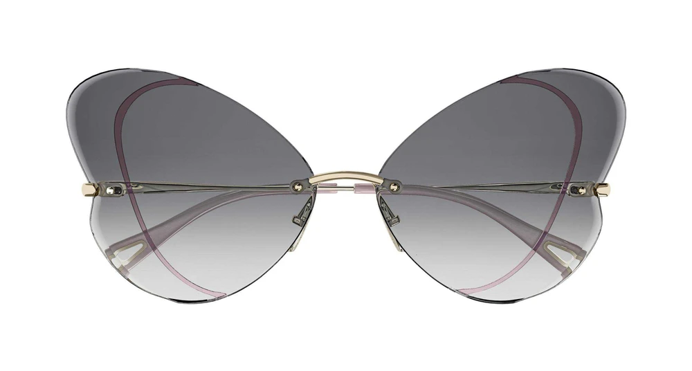 Interpretação elegante do clássico formato borboleta, apresentando lentes espessas chanfradas que acompanham a linha da sobrancelha até a borda arredondada. Gravação interna preenchida com esmalte colorido, criando um contraste sofisticado tom sobre tom. Ponte e rebites em metal com acabamento dourado, aparafusados diretamente nas lentes. O icônico recorte em forma de gota nas pontas das hastes funciona como elemento estético e funcional para fixar as joias da Chloé, enriquecido com o logo gravado.
