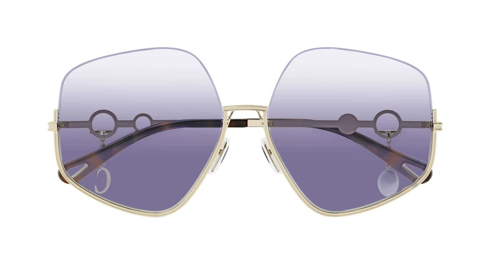 Armação fashion-forward oversized pentagonal meio aro com acabamento em esmalte que se estende da frente até as hastes. Diferencial com lentes de gradiente invertido. Pingente removível em metal dourado Chloé e pingente decorado com pérolas, acompanhados de corrente e barra em T. Recorte circular na haste para fixação dos pingentes removíveis, além de moeda gravada com o logo Chloé. Recorte icônico em forma de gota nas pontas das hastes, funcionando como elemento estético e funcional para prender as joias ou pingentes da Chloé, enriquecido com logo gravado.