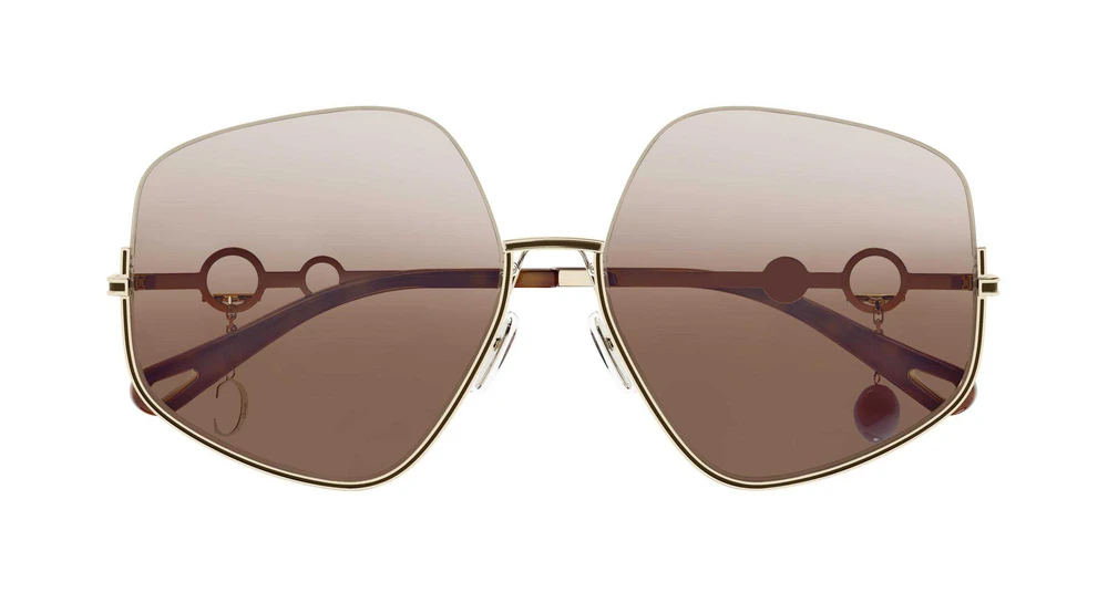 Arrojado e fashionista, este modelo meia-aro pentagonal oversized apresenta acabamento esmaltado que se estende da frente até as hastes. O destaque fica por conta das lentes com degradê invertido, que adicionam um toque inesperado e sofisticado. O design inclui charms removíveis em metal dourado: um com o logotipo Chloé e outro com detalhe de pérola, corrente e fecho tipo T-barre. Um círculo vazado na haste acomoda os charms, junto a uma moeda gravada com o logotipo da marca. As ponteiras em acetato trazem o icônico recorte em forma de gota, funcional e estético, ideal para prender as joias ou acessórios da linha de óculos Chloé, enriquecido com o logo gravado.